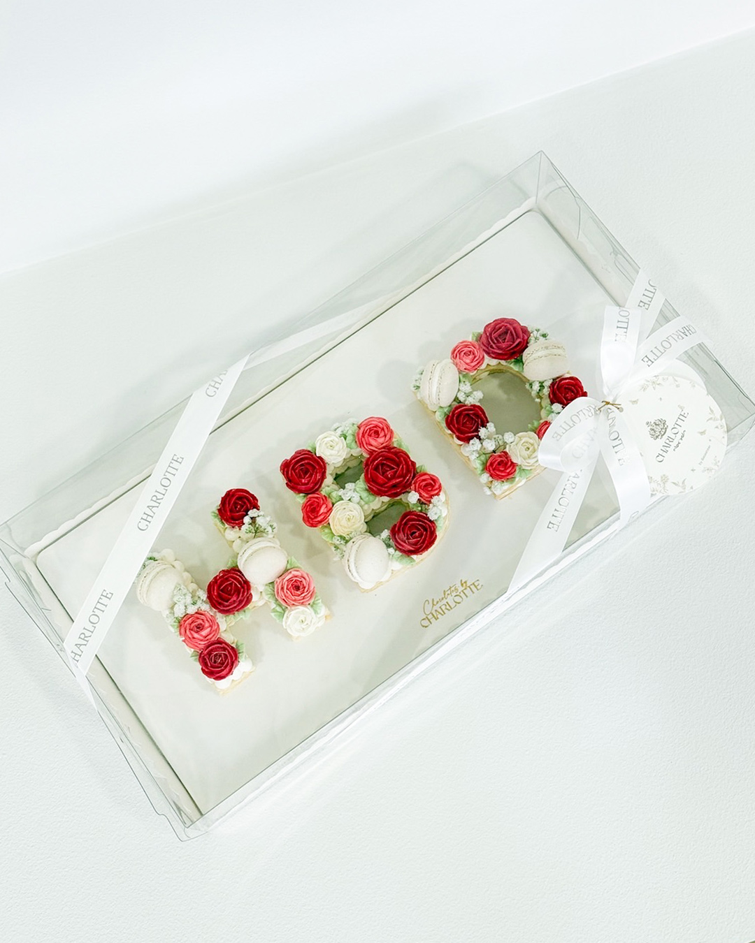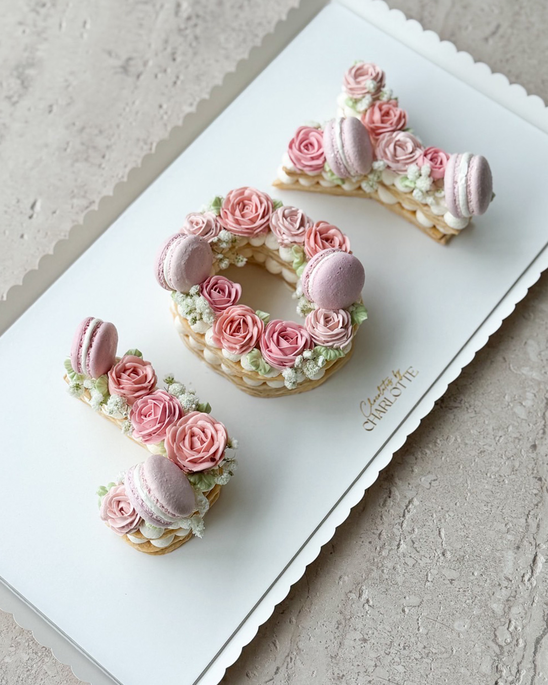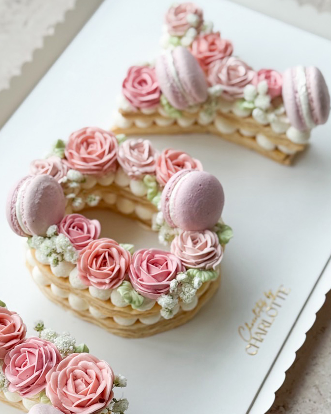 HBD Pastry Letter Pie Cake Celebrate special moments with our signature puff pastry cakes from Its Charlotte Bakery — a buttery, flaky pastry filled with smooth cream, beautifully topped with pastel macarons and delicate rose-inspired piping. A charming, made-to-order cake perfect for any meaningful occasion.