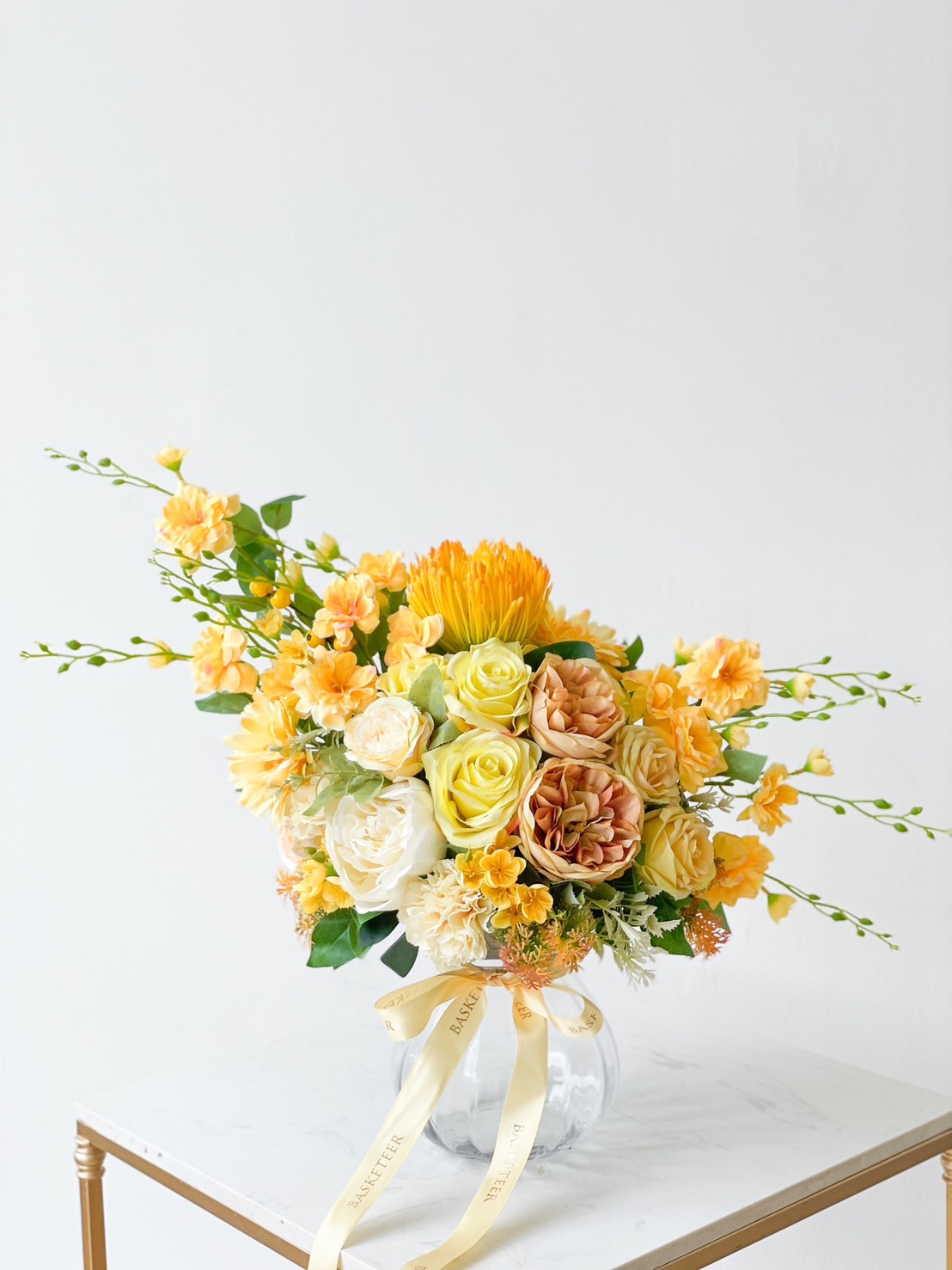 Artificial Flowers In Vase Yellow Tone Brighten up any room with this vibrant artificial flower arrangement. Featuring a delightful mix of yellow and peach blossoms, this arrangement is housed in a clear, round glass vase that showcases the stunning colors and textures of each flower. Perfect for adding a touch of cheer and elegance to your home, office, or special event.
