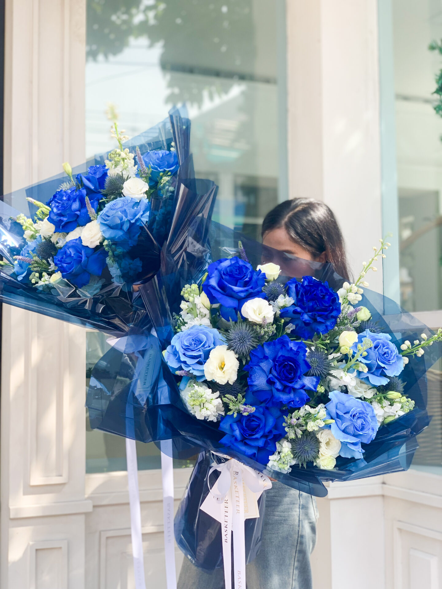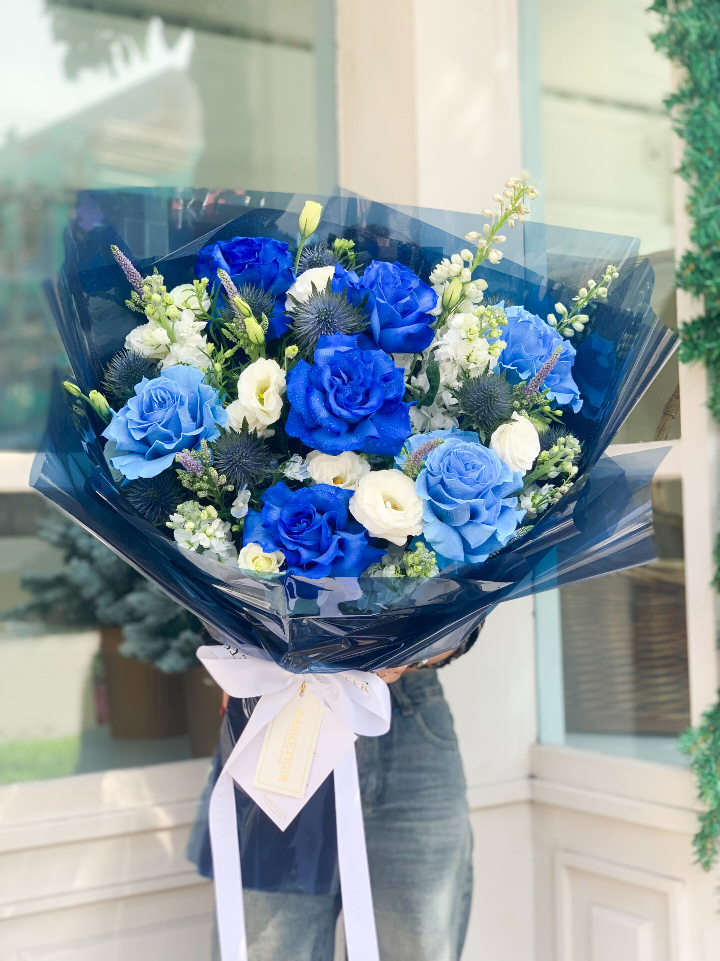 Blue Rose Bouquet Introducing our exquisite floral bouquet, featuring a stunning array of blue and white roses, delicately arranged with seasonal greenery and wrapped in elegant blue paper. This bouquet is perfect for special occasions, expressing your heartfelt emotions, or simply brightening up any room.