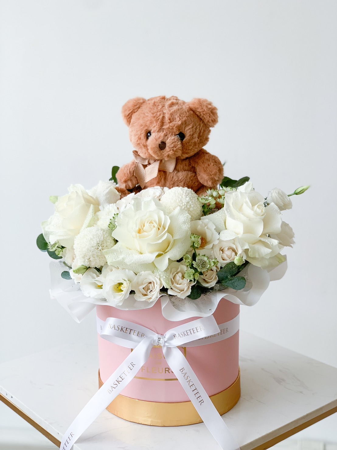 White Elegance Flower Box with Teddy Bear This charming flower box is filled with elegant white roses, creamy calla lilies, and soft ivory spray roses. Topped with a cuddly grey teddy bear, it’s the perfect gift to bring warmth and smiles on a special birthday.
