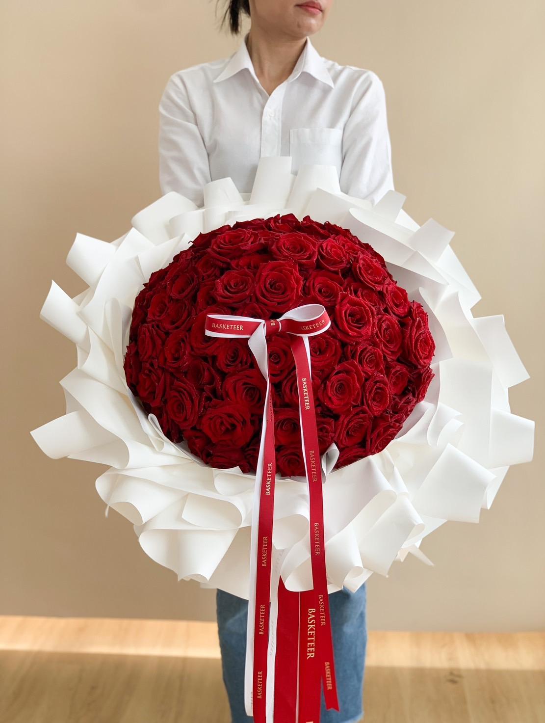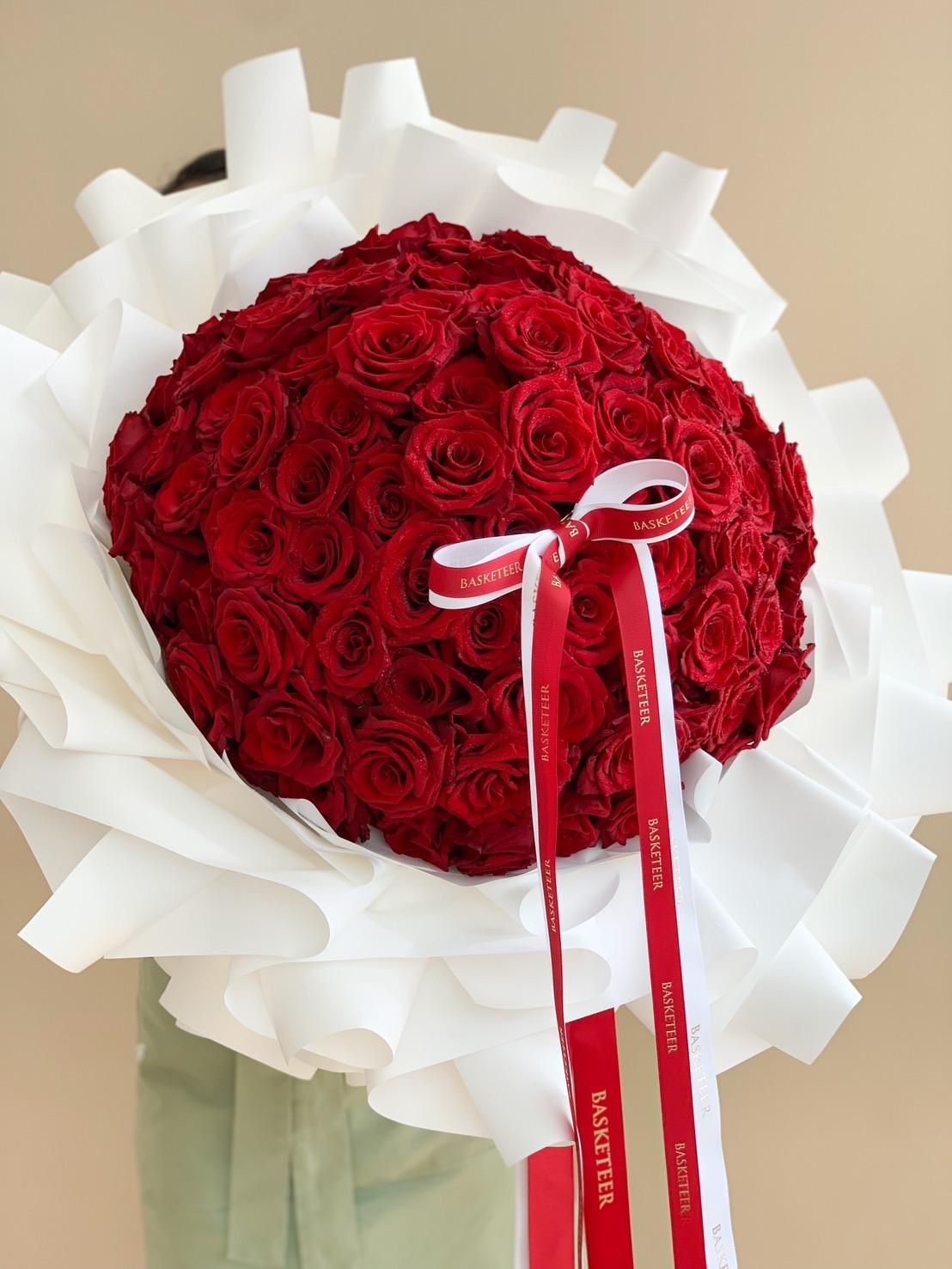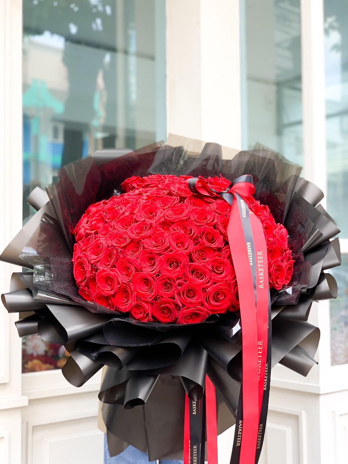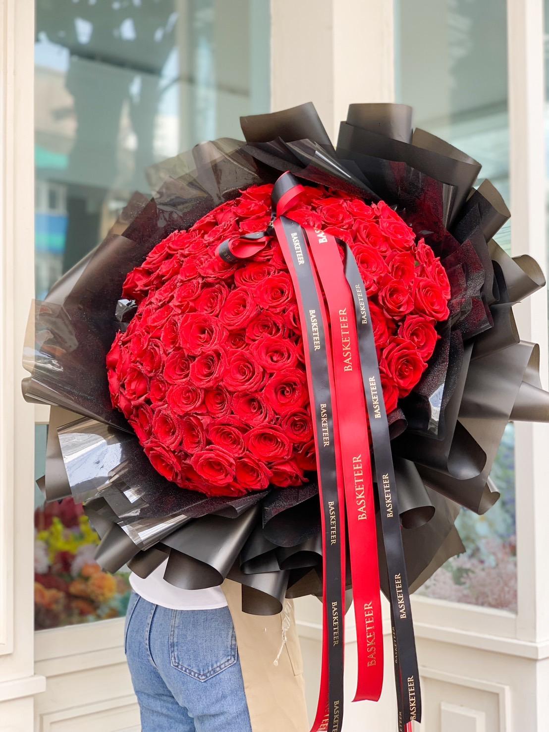 Ultimate Red Rose Bouquet This breathtaking bouquet of 100 vibrant red roses is the ultimate symbol of love and passion. Wrapped in elegant black paper and adorned with striking red and white ribbons, it’s the perfect gift for anniversaries, proposals, or any romantic celebration. Impress your loved one with timeless beauty and grandeur.