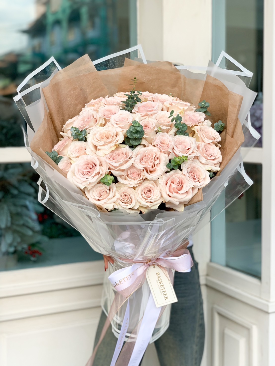 Blush Pink Rose Bouquet Make a statement with this exquisite bouquet of blush pink roses, hand-picked for their delicate beauty and timeless charm. Wrapped in soft-toned paper with elegant ribbons, this bouquet is a perfect way to express love, admiration, and heartfelt emotions.