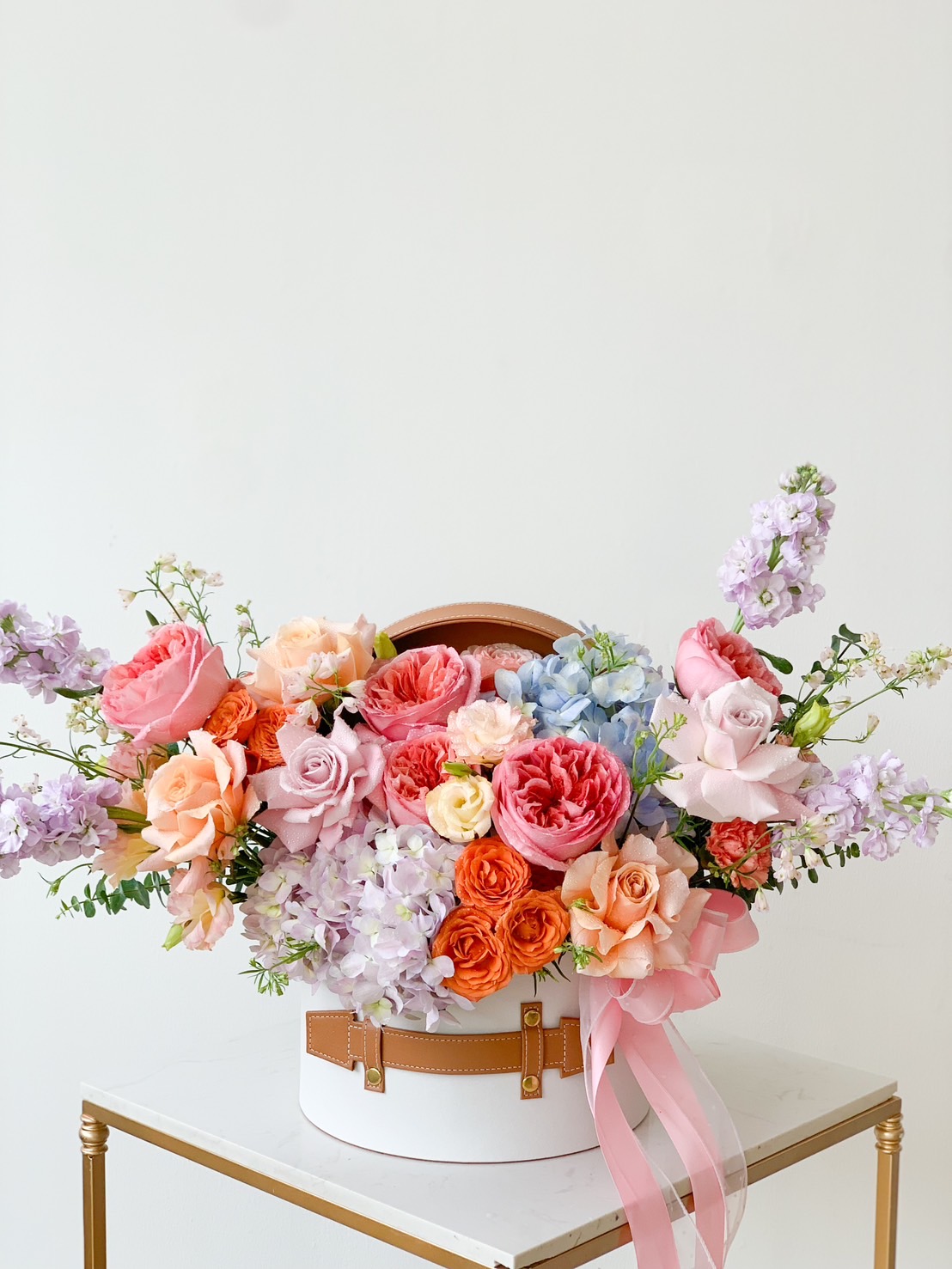 Pink Blossom Dreams Flower Box Overflowing with charm, this flower box showcases a lively blend of pink garden roses, lavender roses, purple hydrangeas, and pastel snapdragons. Artfully arranged in a signature white hatbox with beige leather accents and a soft ribbon bow.