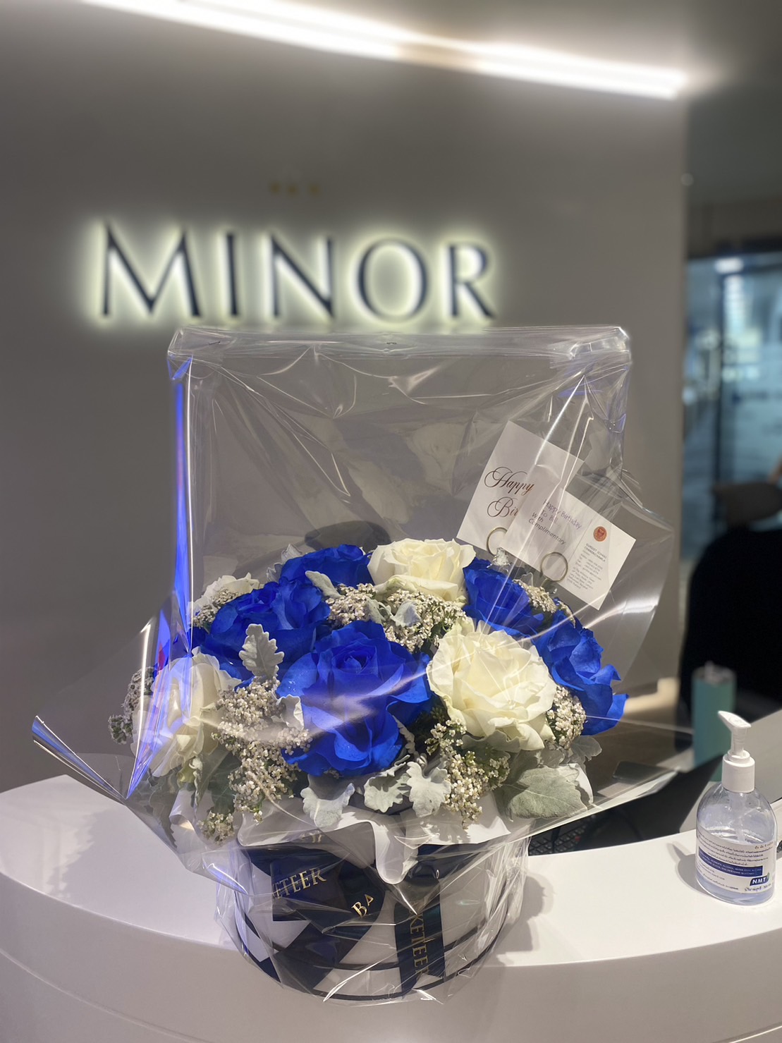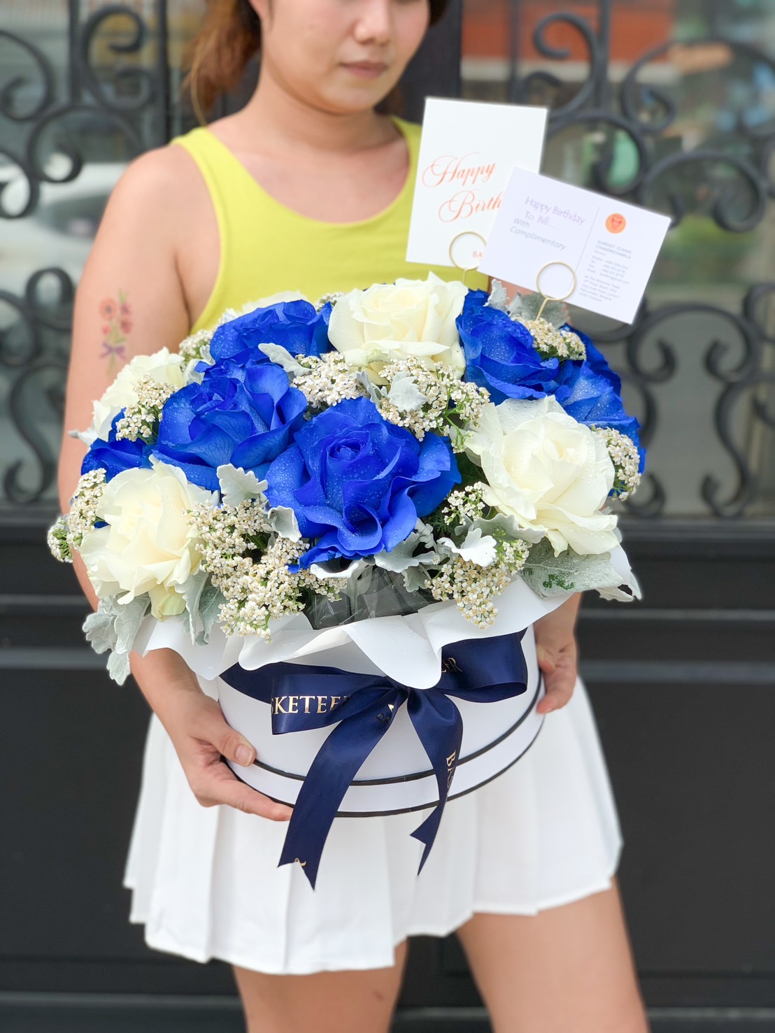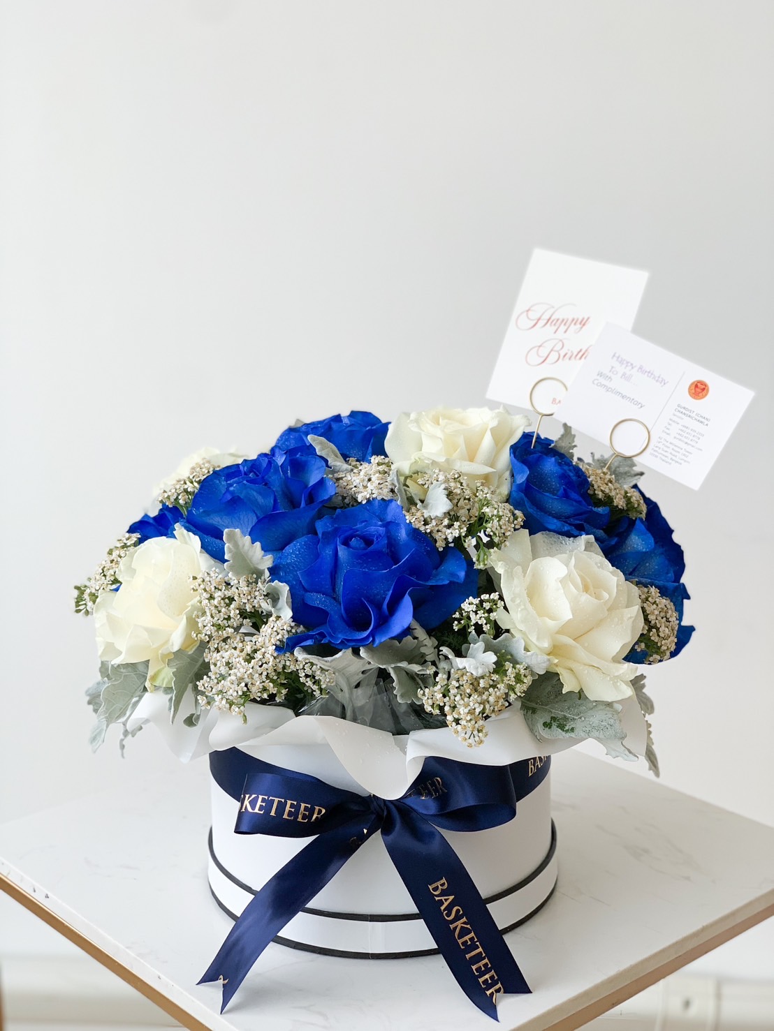 Royal Blue Rose Gift Box Make a lasting impression with this luxurious floral box featuring a striking combination of deep royal blue and pure white roses. Accented with soft foliage and dainty blooms, and finished with a sophisticated navy ribbon, this arrangement is a refined way to celebrate achievements, promotions, graduations, or any special milestone.