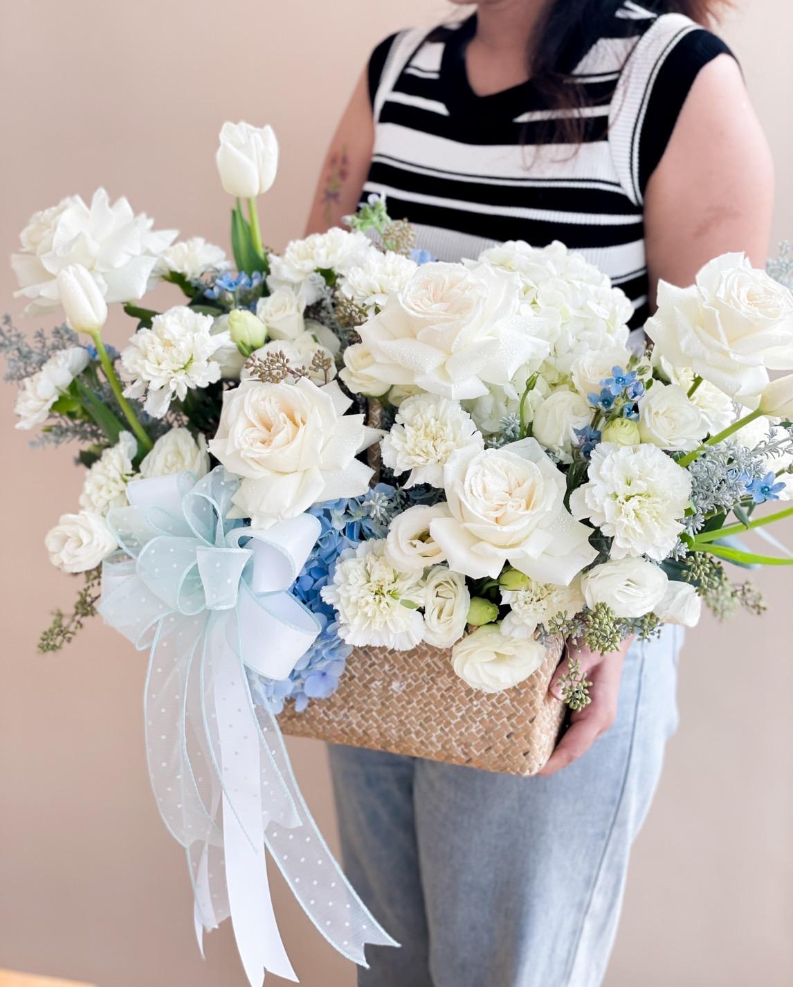 Elegant Serenity Flowers Basket A graceful gift of peace and purity, our Elegant Serenity Flower Basket features ivory roses, creamy lisianthus, blue hydrangeas, and delicate white fillers in a handwoven wicker basket. Designed for heartfelt occasions—from sending condolences to celebrating life's calm and meaningful moments—this premium floral arrangement exudes quiet elegance and composure.