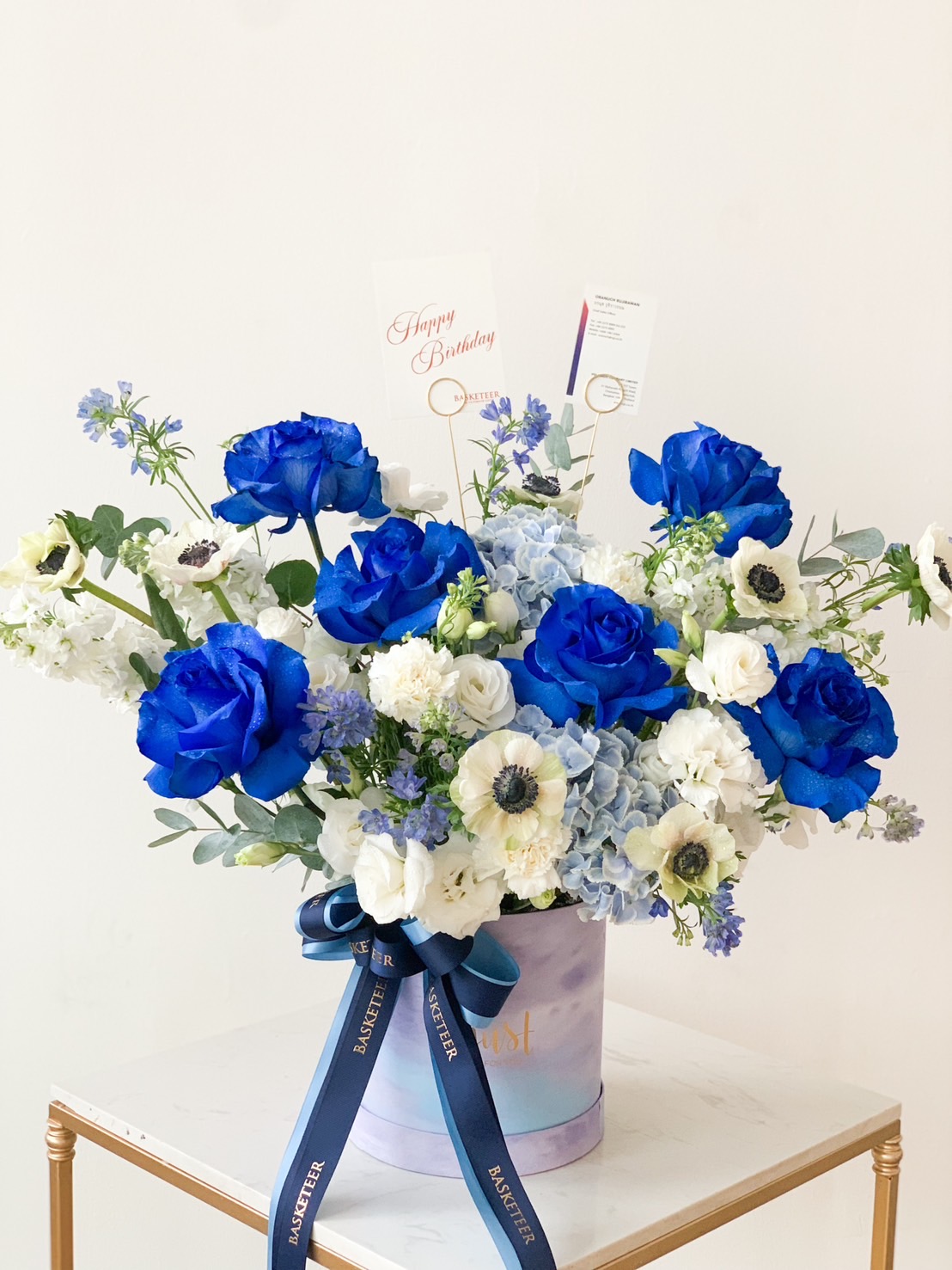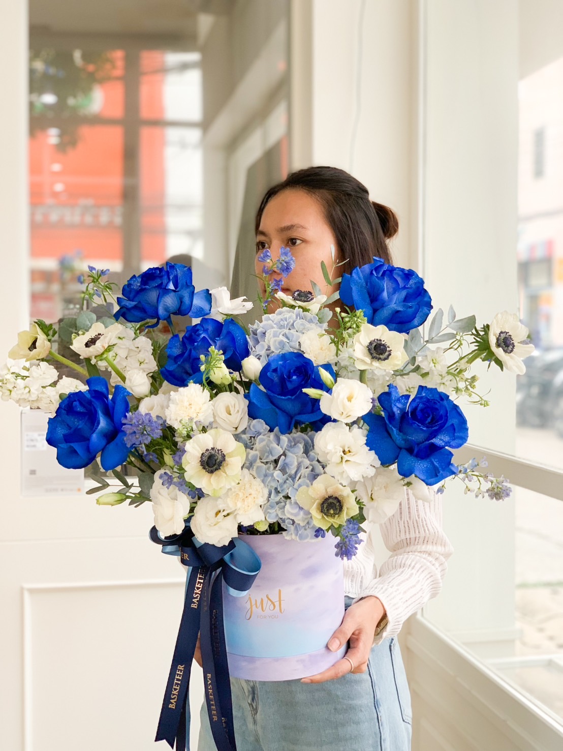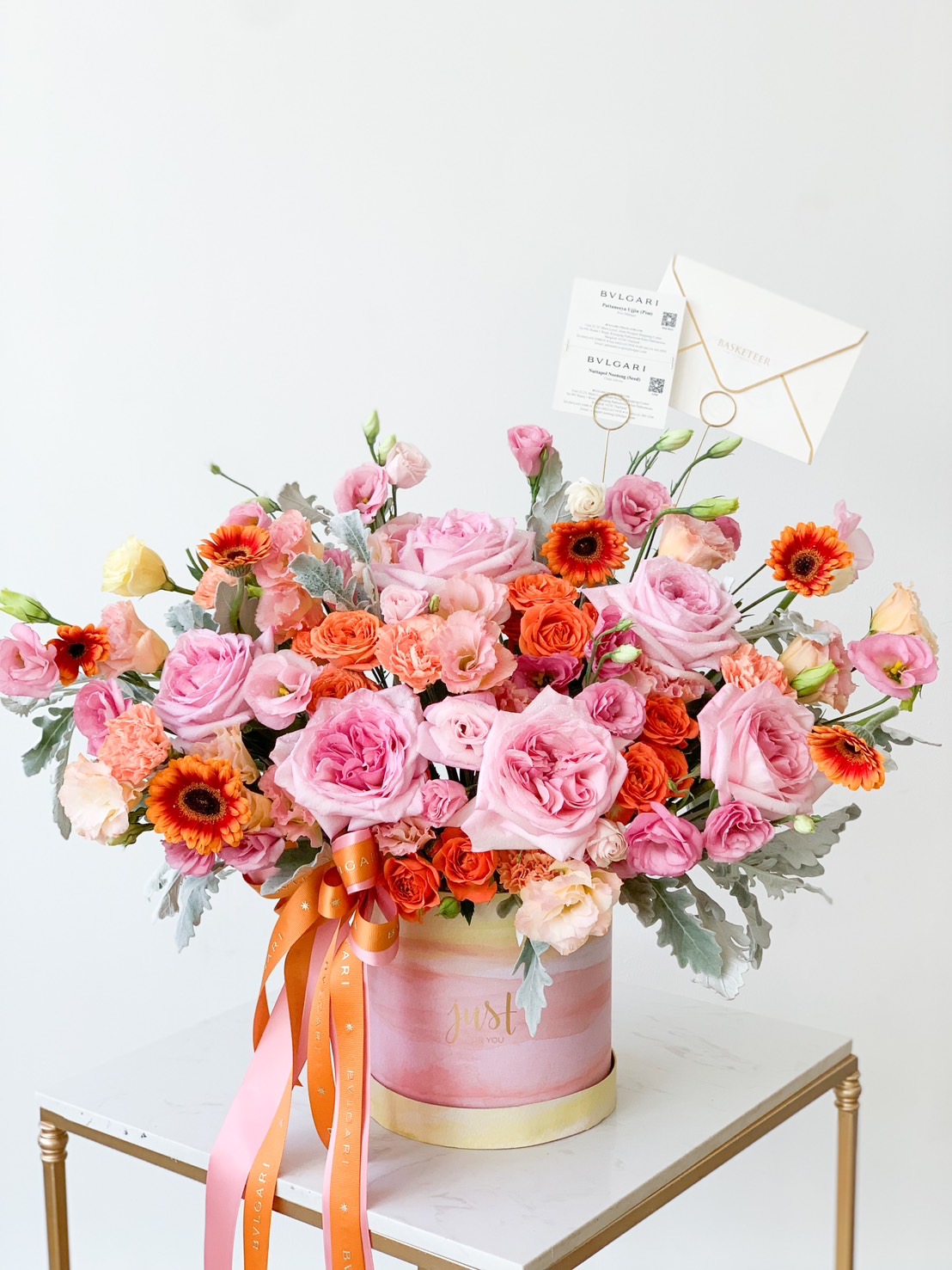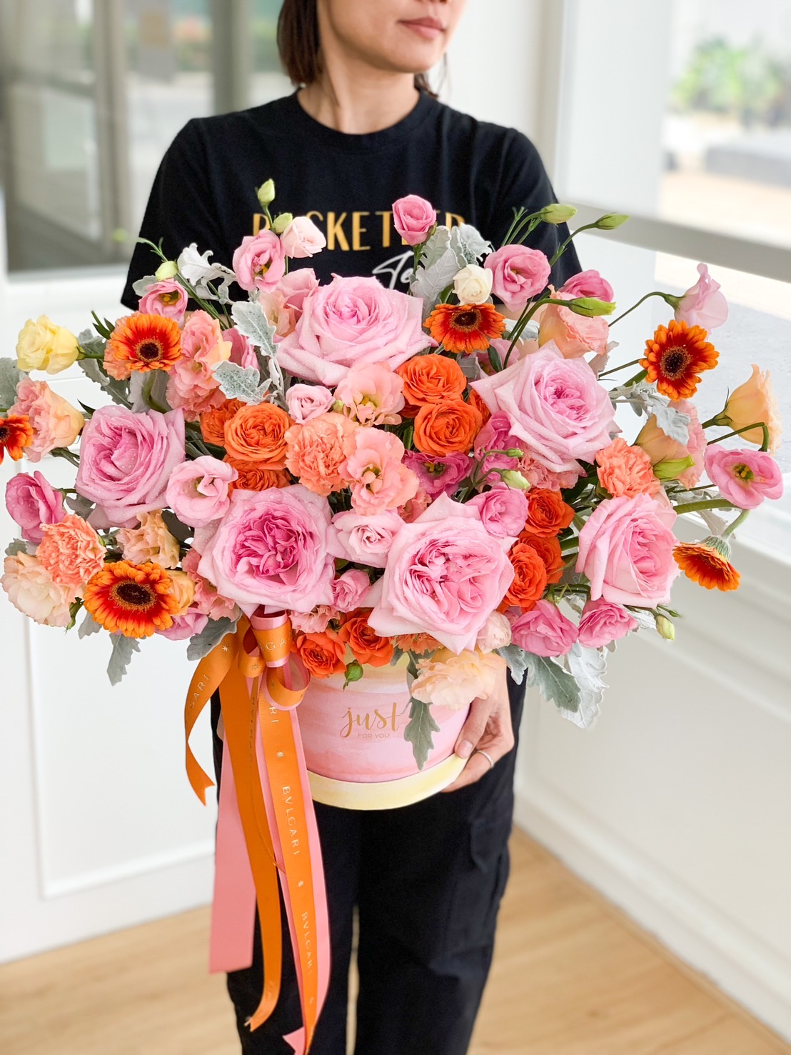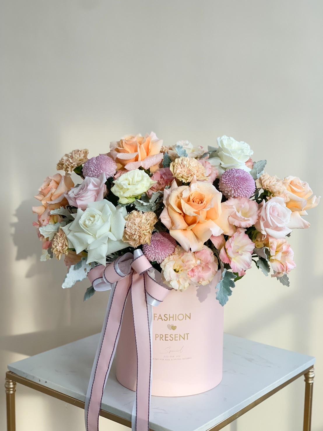 Shady and Colorful Flowers Gifts Box This luxurious flower arrangement features a soft pastel palette of blush pink, cream, and white florals including roses, carnations, lisianthus, and delicate filler flowers. Beautifully presented in a round box with a "Just for You" message and finished with Basketeer’s elegant ribbon, this floral creation is perfect for birthdays, celebrations, anniversaries, or simply to brighten someone's day.