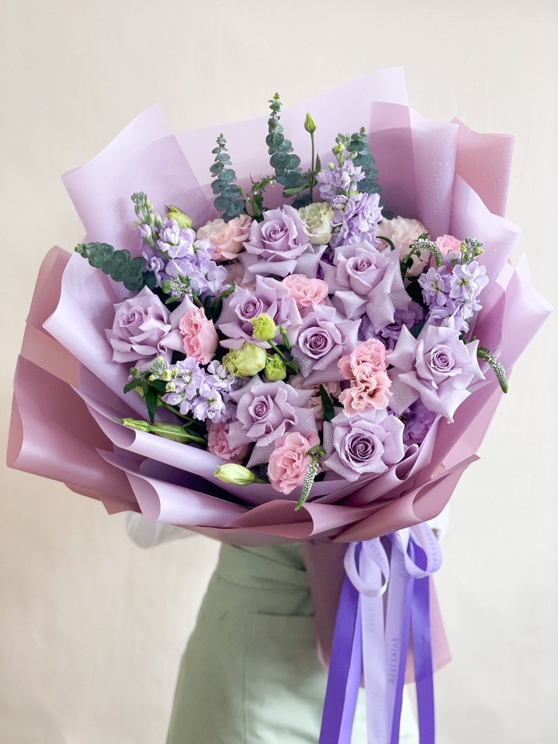 Purple & Pink Pastel Romance Bouquet Embrace the gentle elegance of our Pastel Romance Bouquet, a delightful arrangement perfect for any romantic occasion. This bouquet features a harmonious blend of soft pink roses, light purple lisianthus, and delicate white anemones, all artfully arranged with lush greenery. The bouquet is wrapped in luxurious white paper and tied with a pastel pink ribbon, making it an exquisite gift that conveys heartfelt emotions.