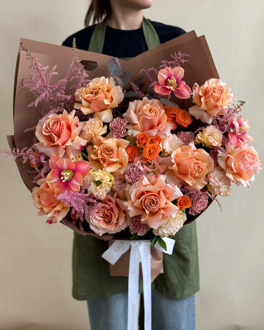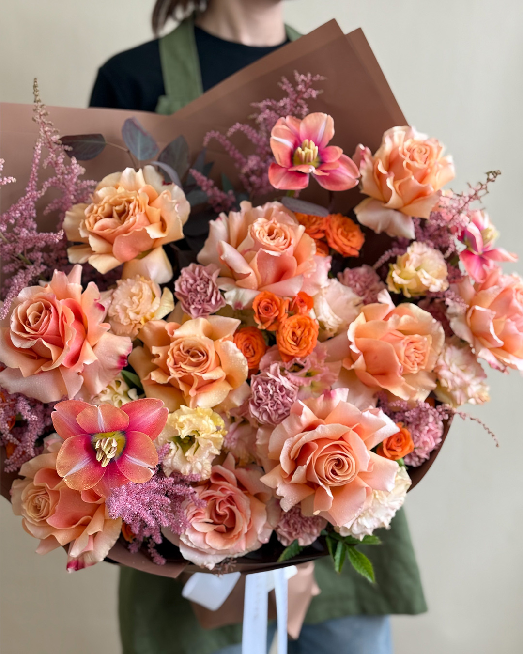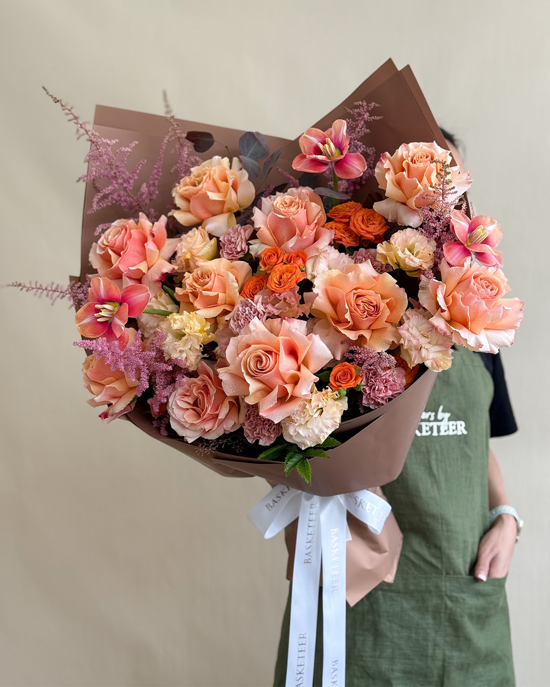 Sunset Orange Rose & Ranunculus Bouquet Brighten someone's day with this luxury bouquet of Tiffany roses, spray roses, ranunculus, yellow lisianthus, and blushing bride protea—rich in colour and warmth.