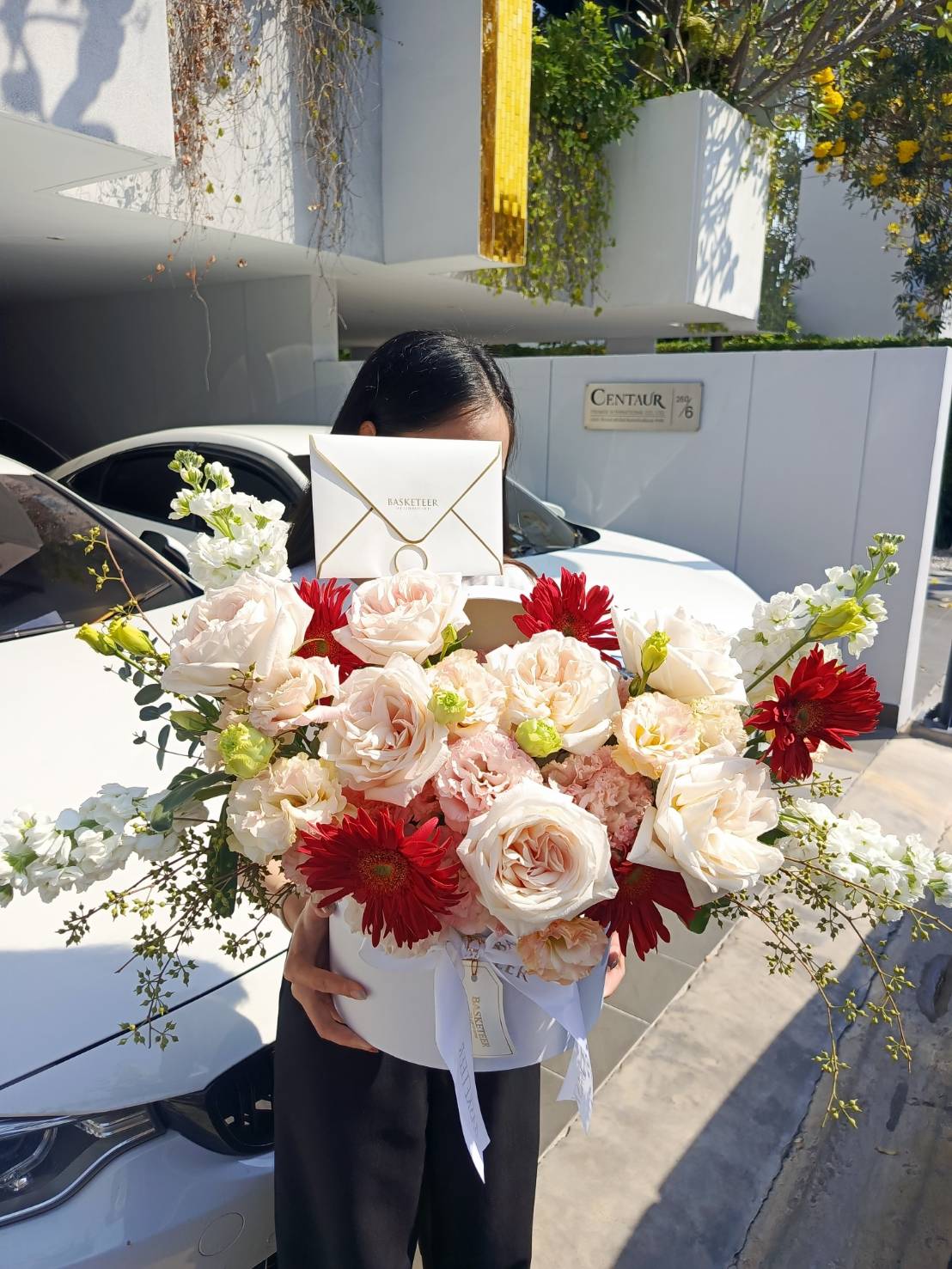 Timeless White and Red Flower Box Celebrate any occasion with a chic flower box featuring white roses, red gerberas, and pastel blooms. Perfect for weddings, anniversaries, or special moments, this arrangement exudes timeless elegance.