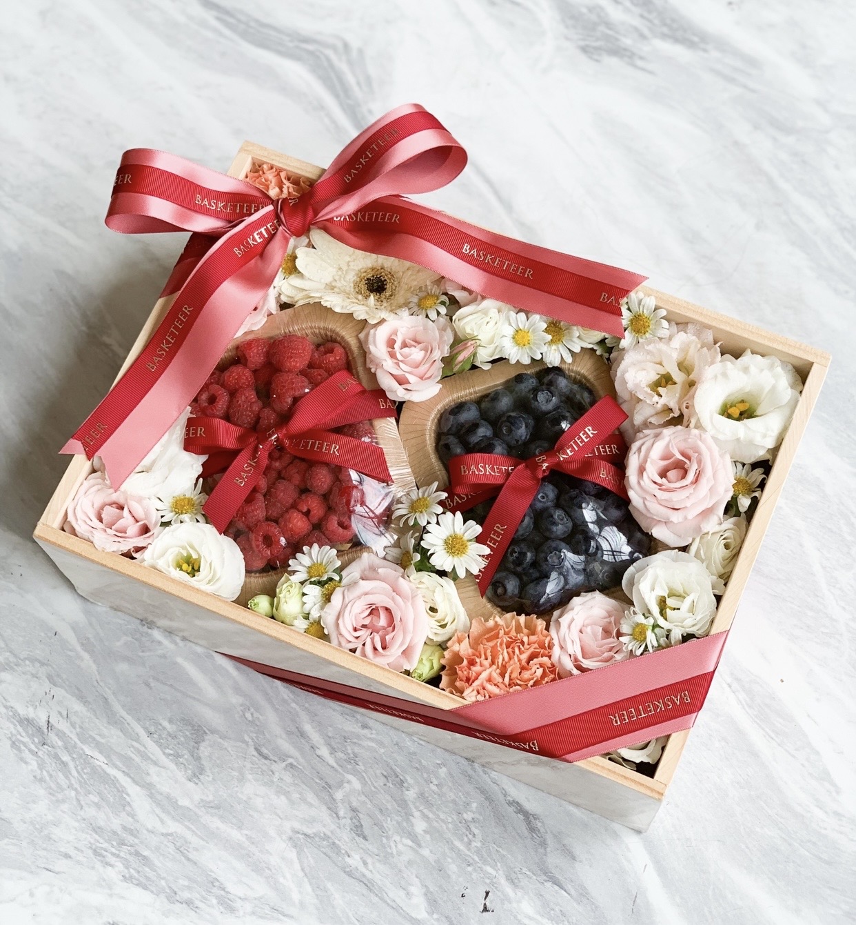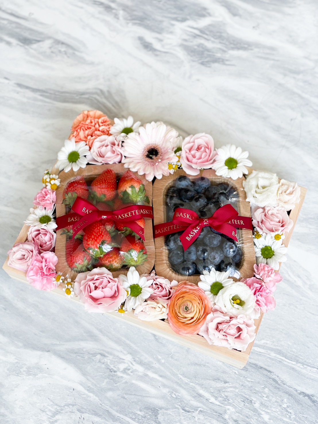 Berry Duo Wooden Gift Box Discover the perfect fusion of fresh berries and vibrant flowers with our Mixed Berry Floral Box. Featuring succulent blueberries and raspberries paired with a stunning array of carnations, daisies, lisianthus, and roses, this arrangement is adorned with elegant red and pink ribbons. Ideal for special occasions, this stylish wooden box offers a unique and charming way to convey love, gratitude, or congratulations.