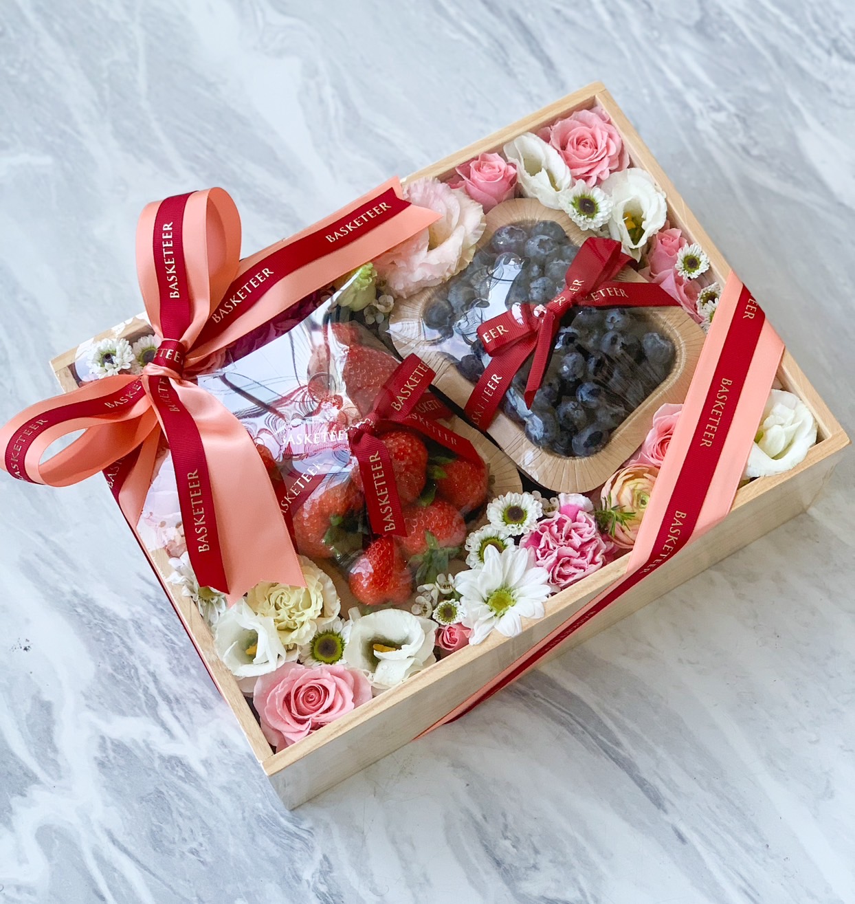 Sweet Berry Gift Box Set Elevate your gift-giving with our Strawberry and Blueberry Garden Tray, featuring a delightful mix of fresh strawberries and blueberries artfully arranged with vibrant blooms. This beautifully crafted wooden tray, tied with a signature red ribbon, adds a touch of elegance to any occasion.