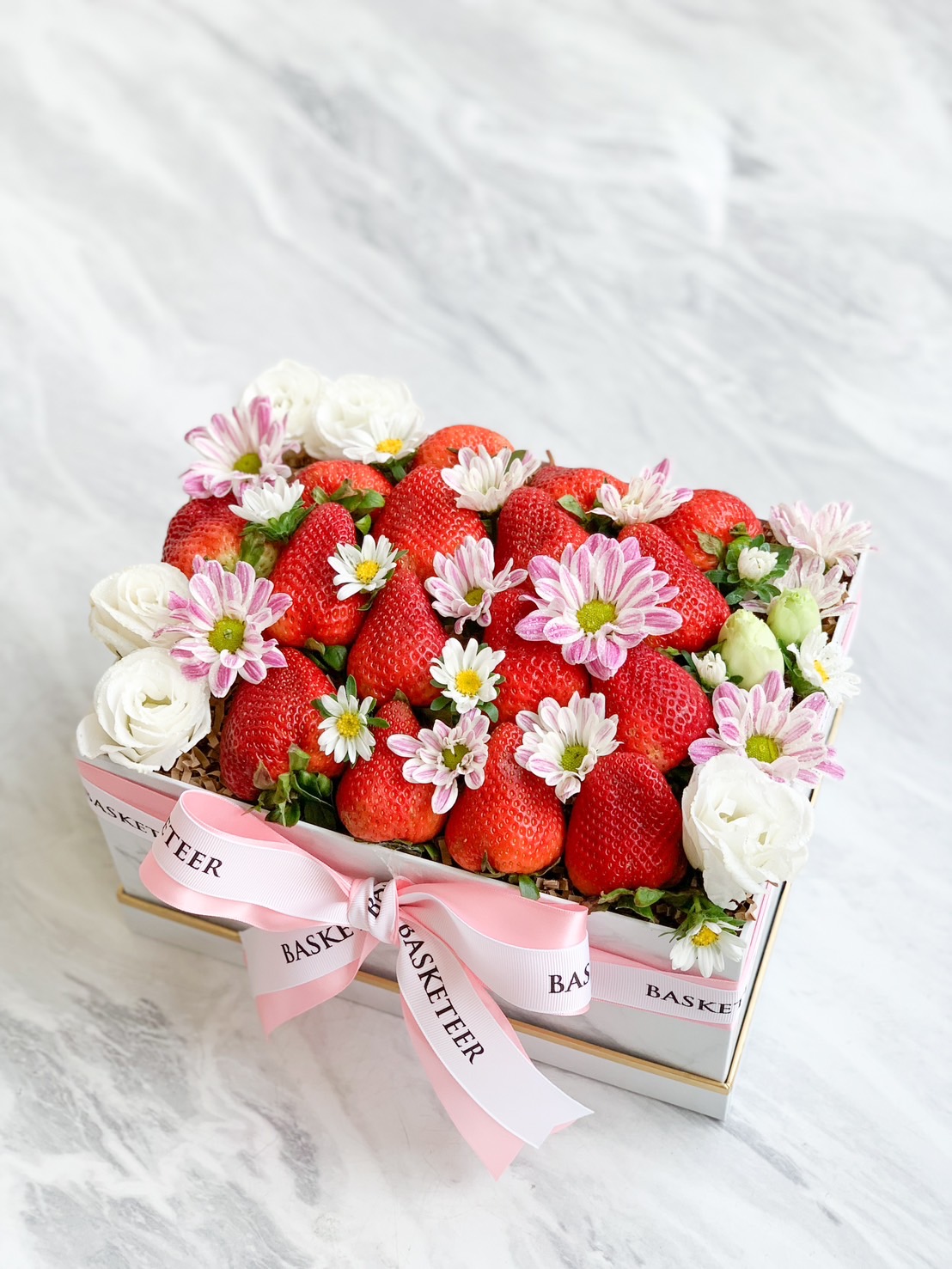 Strawberry Bliss Gift Box Indulge in the sweetness of fresh strawberries paired with the delicate beauty of pink daisies and white lisianthus. This elegant arrangement is a feast for the eyes and taste buds, making it a perfect gift for any occasion. Presented in a stylish box with a ribbon, it's the ideal way to express love and gratitude.