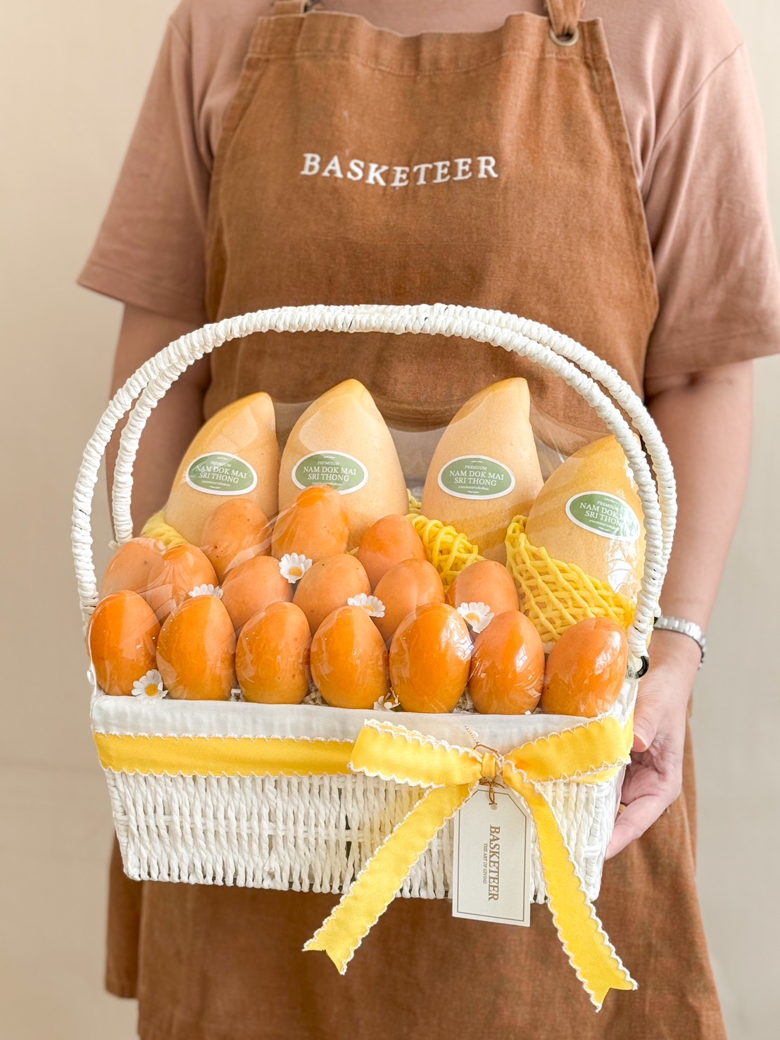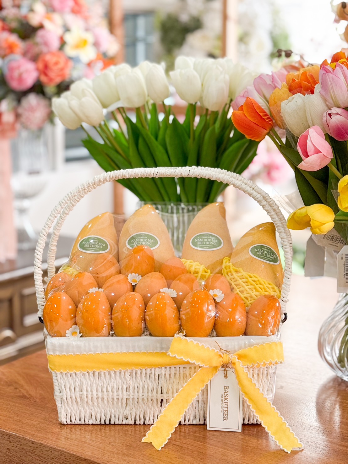 A sophisticated white wicker basket filled with premium Toon Klaow variety Mayongchid and Nam Dok Mai Barracuda Mangoes, elegantly adorned with a yellow satin ribbon and delicate floral accents.