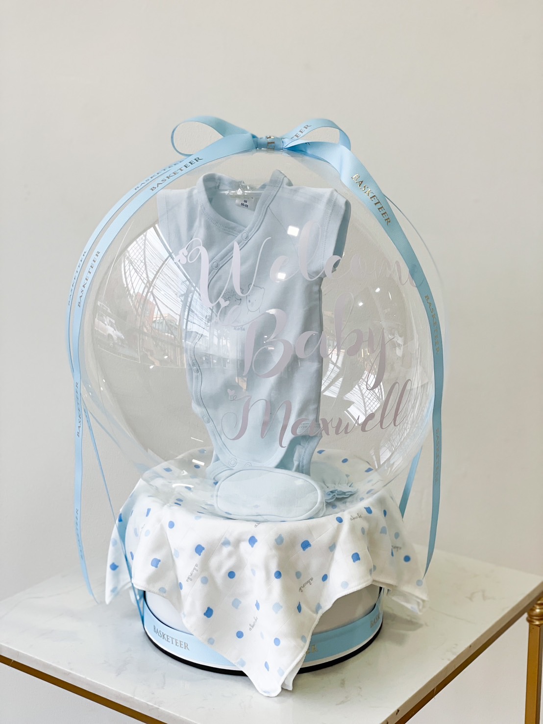 A person elegantly cradles a lavish bouquet of blue, white, and green blooms, artfully wrapped in rich deep blue and translucent paper. The arrangement is adorned with an exquisite white and blue ribbon featuring the distinguished Basketeer logo. The mysterious giver is partially obscured behind the opulent floral masterpiece, donning a crisp white shirt complemented by a sophisticated watch.