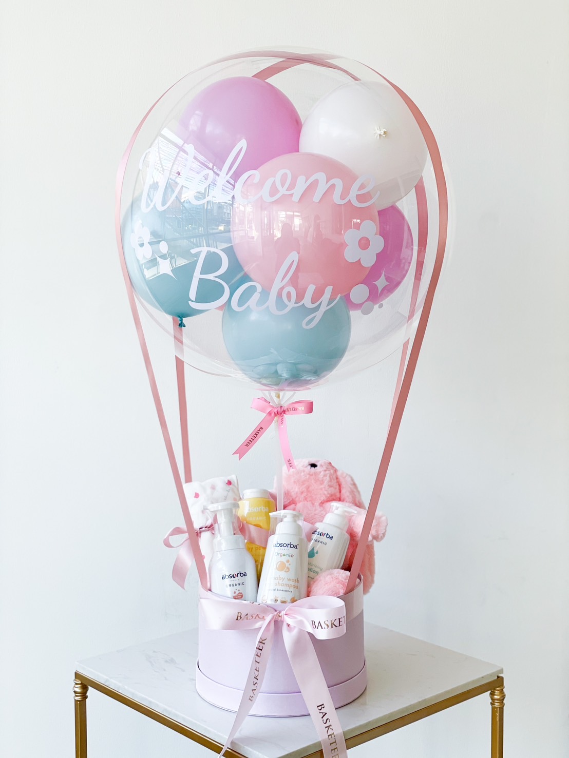 A luxurious pink gift box adorned with an elegant ribbon and the Basketeer logo presents the Bundle of Joy Baby Essentials. Inside, you'll find an array of premium baby care products, a plush stuffed animal, and a stunning large transparent balloon that reads