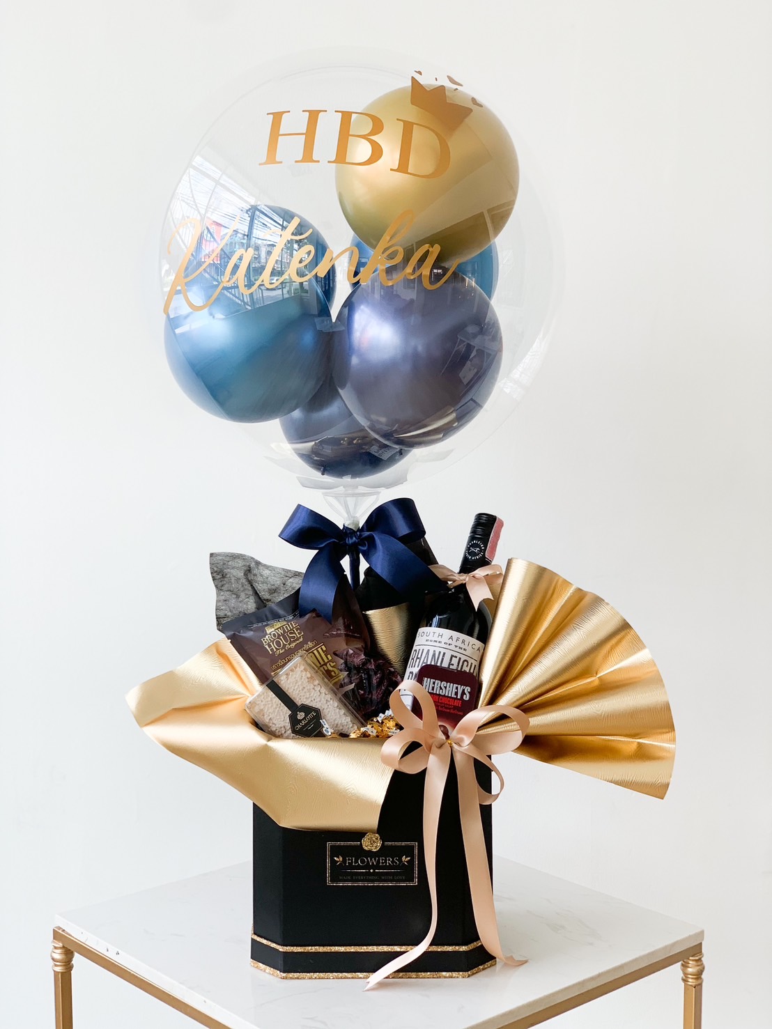 An opulent birthday gift arrangement from Basketeer, showcased in an elegant black box adorned with gold trim. Inside, a delectable Hershey's chocolate bar and a luxurious Ferrero Rocher package nestle alongside a bottle of exquisite bubbly champagne and other sumptuous gold-wrapped treasures. Hovering above, a clear balloon filled with chic blue and gold balloons proudly displays