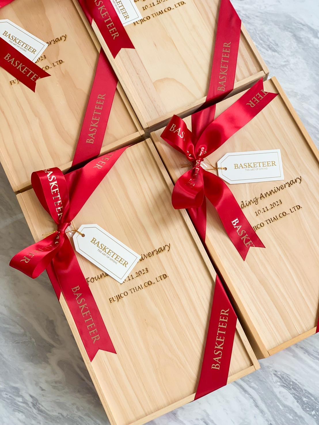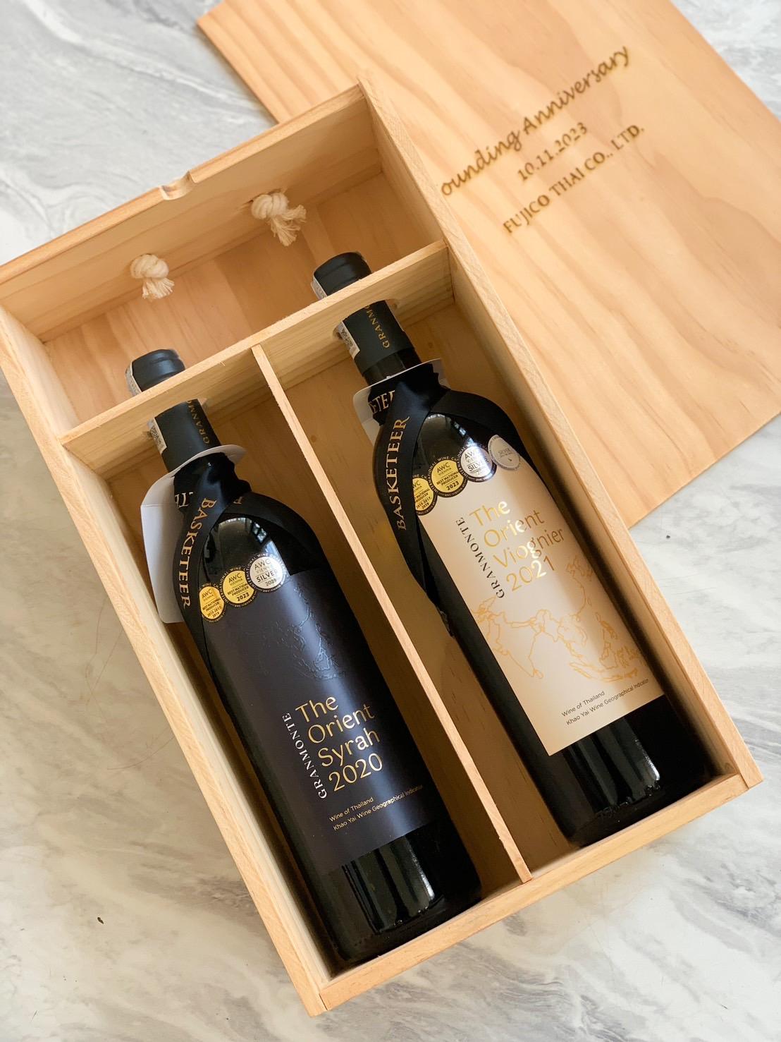 A luxurious wooden box from Basketeer, adorned with elegant branding, rests gracefully on a pristine white surface. Within the box, two exquisite bottles of GranMonte wine—one red and one white—beckon invitingly. The propped-open lid showcases an artful