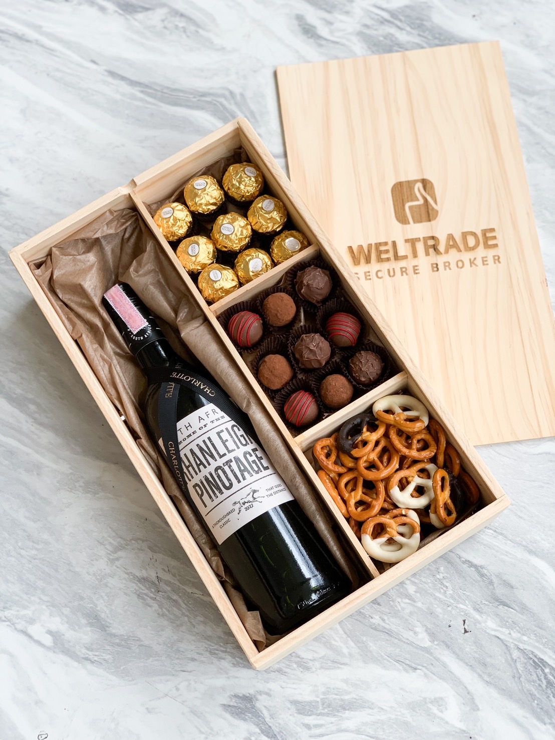 An elegant wooden gift box by Basketeer, featuring a premium bottle of South African red wine, an exquisite selection of assorted chocolates, and indulgent chocolate-covered pretzels. The luxurious box is showcased on a sumptuous beige cloth adorned with festive Christmas ornaments—gold bells and a charming wreath embellished with vibrant red berries. A ribbon graced with the Basketeer logo adds an extra touch of sophistication to this holiday treasure.