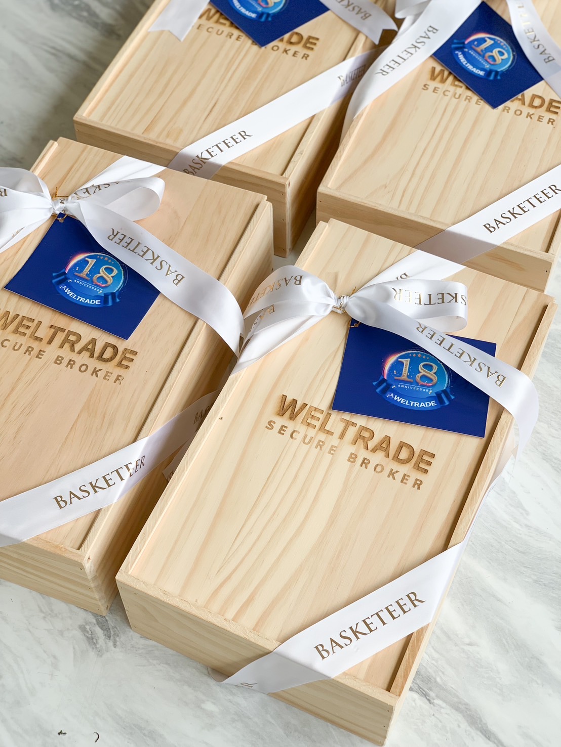 A luxurious wooden gift box adorned with the elegant Basketeer logo, filled meticulously with a bottle of exquisite Rhanleigh Merlot wine. The assortment includes decadent truffles, gourmet pretzels, and opulent Ferrero Rocher chocolates. Nestled amidst these treasures is a silver ribbon that adds a touch of sophistication. This scene is set on a lavishly decorated festive table, surrounded by charming Christmas ornaments that evoke warmth and celebration.