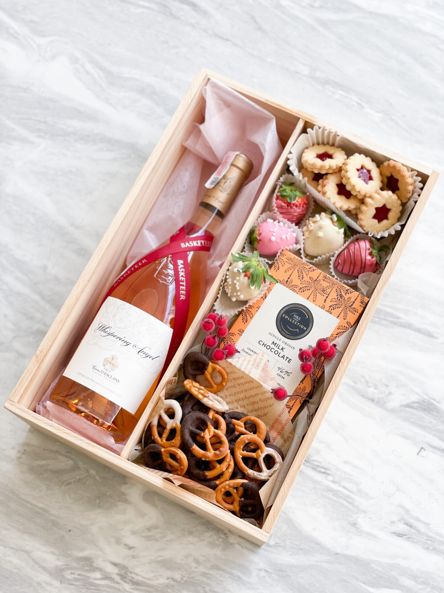 A luxurious wooden gift box from Basketeer, elegantly adorned with a rich red ribbon featuring the Basketeer logo. Inside, discover an exquisite bottle of rosé wine nestled among artisanal assorted chocolates, delectable festive cookies, indulgent chocolate-dipped strawberries, savory mixed pretzels, and succulent cranberries. The scene is artfully complemented by holiday decorations including a lush pine branch and sprigs of vibrant holly, inviting you into a world of opulence and festive cheer.
